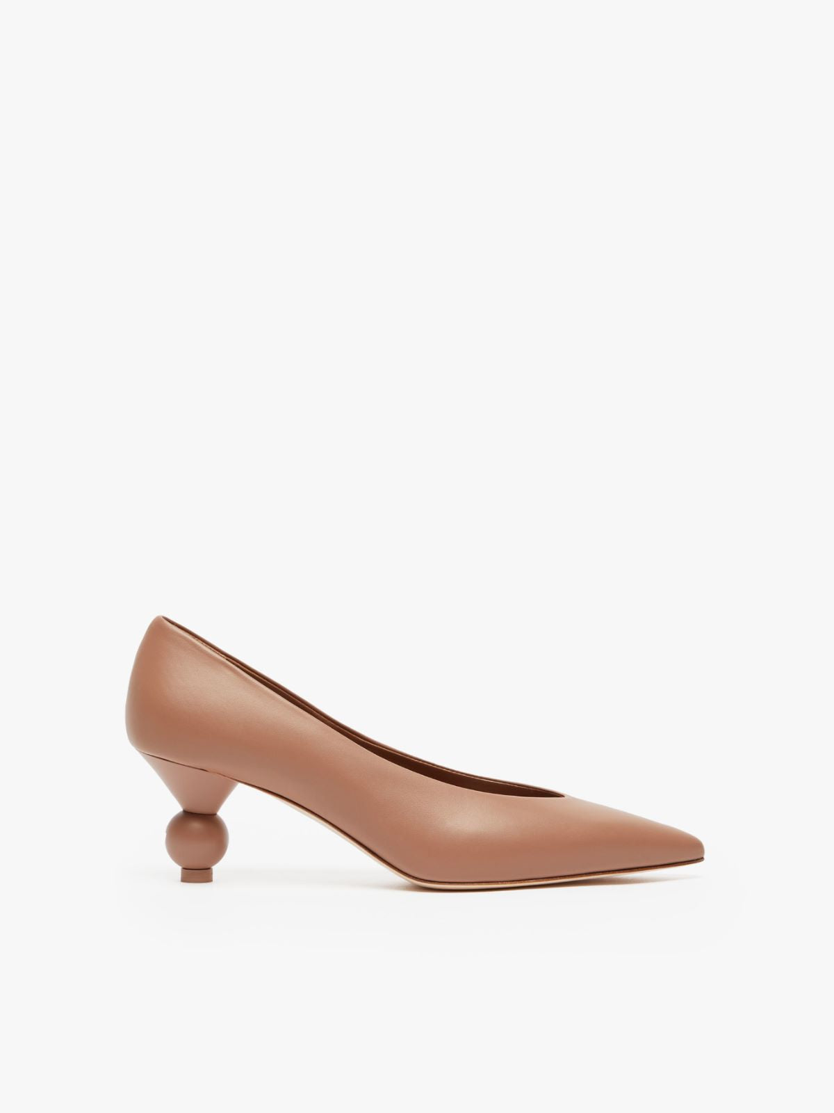 Soft nappa leather pumps with an egg-shaped collar and slightly tapered toe. The design features a matching lacquered bauble heel.