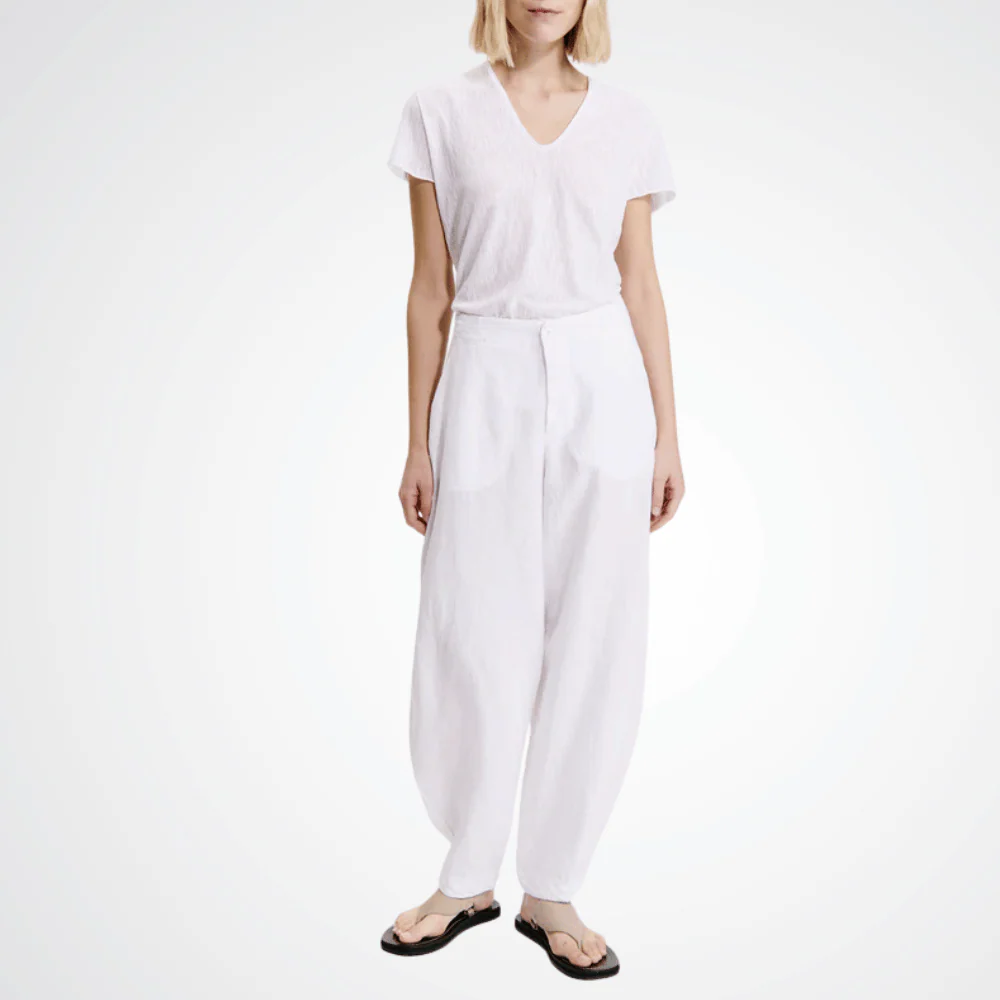 These full-length comfort-fit Transit linen trousers feature a relaxed silhouette with a softly tapered leg, side slash pockets, and a clean waistband for a streamlined finish. Designed in crisp white, the style includes a textured linen-blend inner belt with subtle perforated detailing for an artisanal touch.