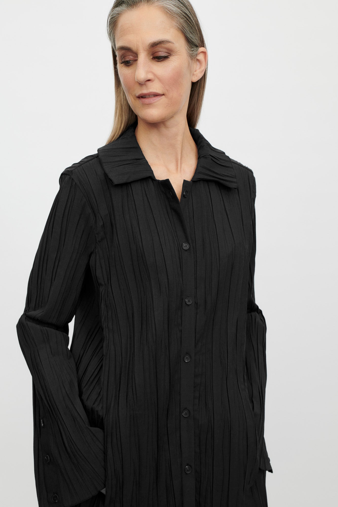 • Long blouse made of pleated wool material