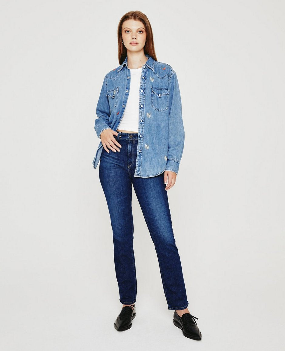 Saige is a women's high-rise straight jean, done here in a deep indigo wash with a faded finish. This high-rise straight is designed in 11 oz. Journey Denim, a comfortable stretch fabric for everyday wear. Saige is complete with a zip fly, angled yoke, and slightly forward side seams.