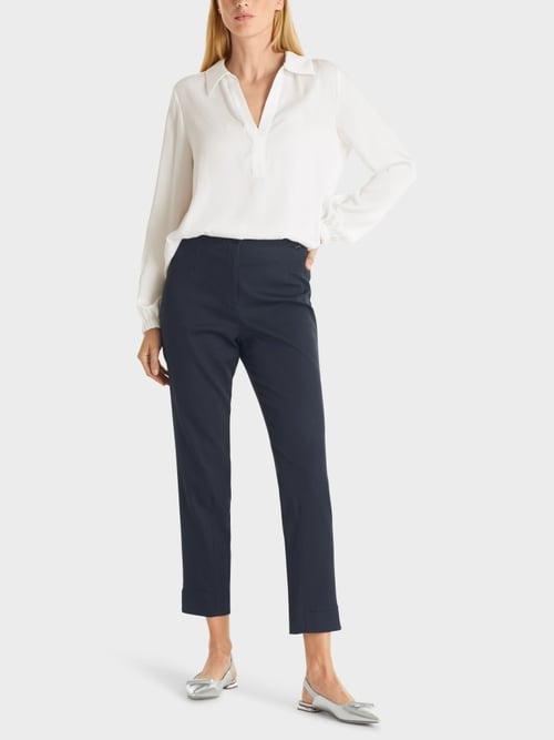 SPLIT pants are made from a soft and flexible cotton/viscose blend. The waist and hips are narrow and the leg tapers towards the ankle. The body-hugging shape is based on an inside waistband, darts at the front and a split seam at the back. The pants close with zip and button.