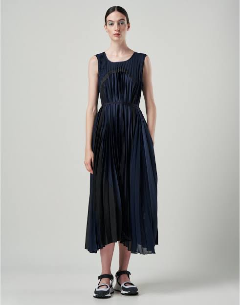 Sleeveless dress in technical satin and georgette. Wide round neckline and armhole bound in satin. Front is constructed in a series of circular cut panels curving from the neck and out to the side seams. The whole front has been sun-ray pleated from the neck with pleats flaring out to full width at the hem. The reverse has across back yoke in satin with the same construction of circular panels in with sun-ray pleating starting from the yoke and opening to its fullest extent at the wide hem. Inseam pockets at the side. Hugely flaring full volume dress can be belted in at the waist with a tape tie belt.