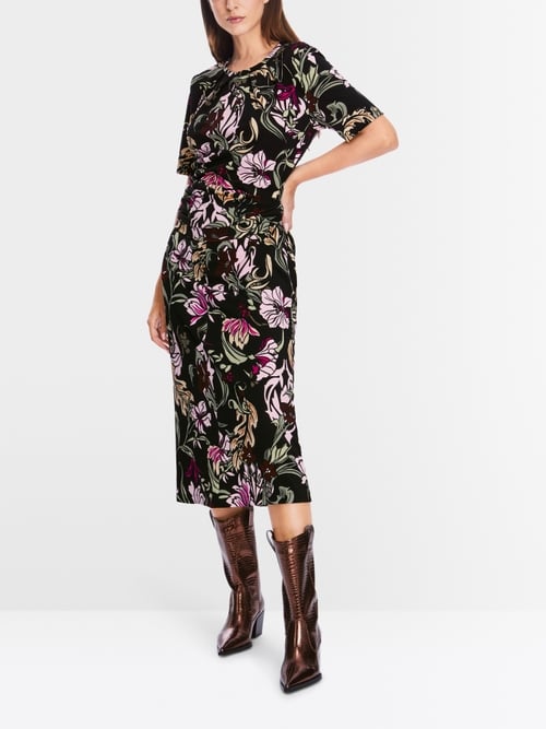 Dress in soft, flowing fabric with elastane content. This dress features an all-over floral pattern. The top is pleated. The accentuated waist gives it an hourglass silhouette. The dress is midi length and comes with short sleeves. It fastens with a zip at the back.