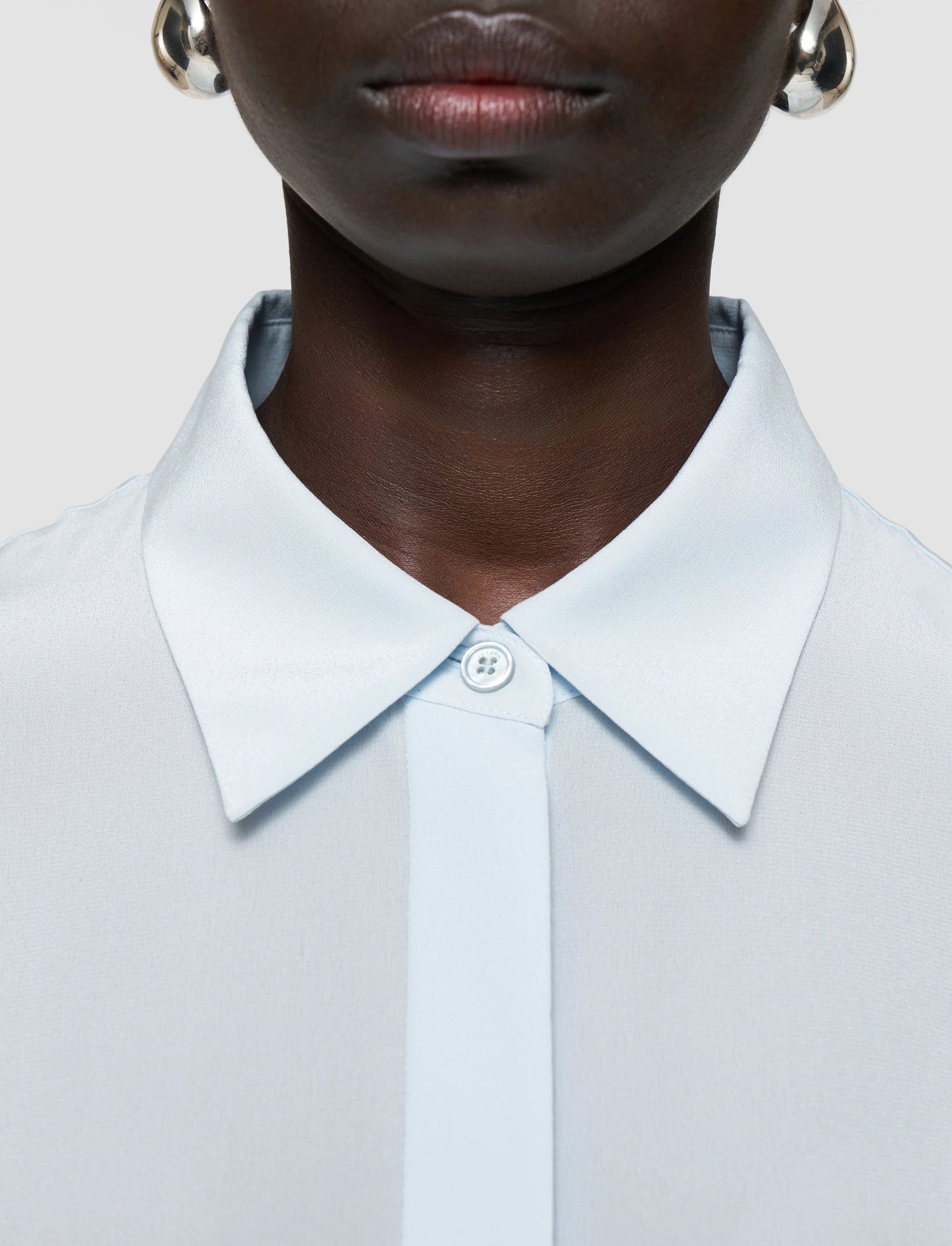 The Bold Crepe de Soie Silk Blouse is a relaxed fit blouse, crafted from a lightweight silk crepe. This fluid blouse features a hidden placket, offering a clean, classic look. Its step hemline adds versatility; tuck-in with ease or wear it loose.