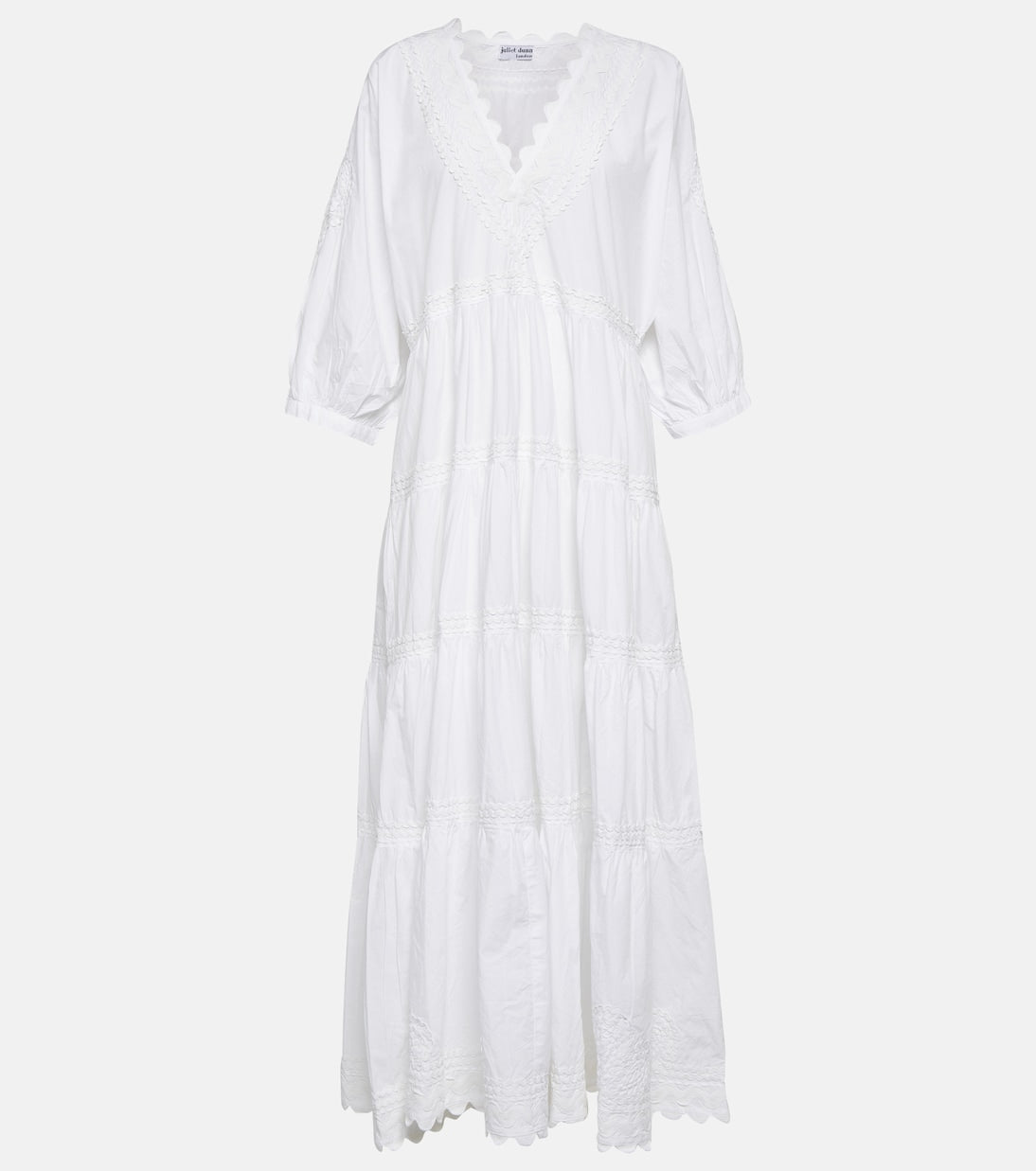 Embroidered cotton poplin maxi dress. A free and loose maxi dress. A deep V falls down the body and creates a flattering silhouette. The tiered hemline means this dress flows with every step. Poplin has more structure than our other cotton styles, which means this unlined dress can be worn without a slip.