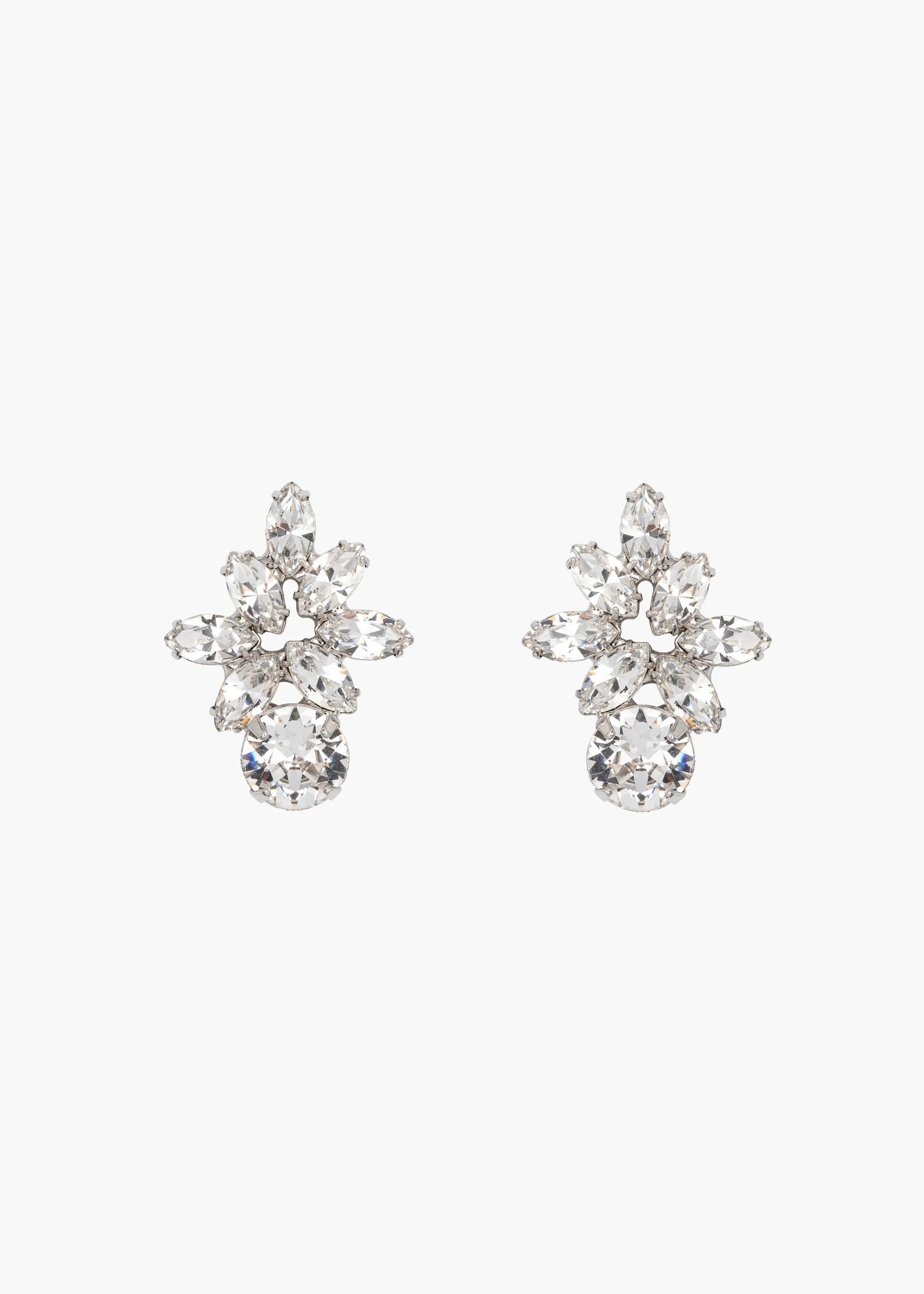 'Maura' earrings are cast from rhodium-plated metal and set with crystals arranged in the shape of flowers.