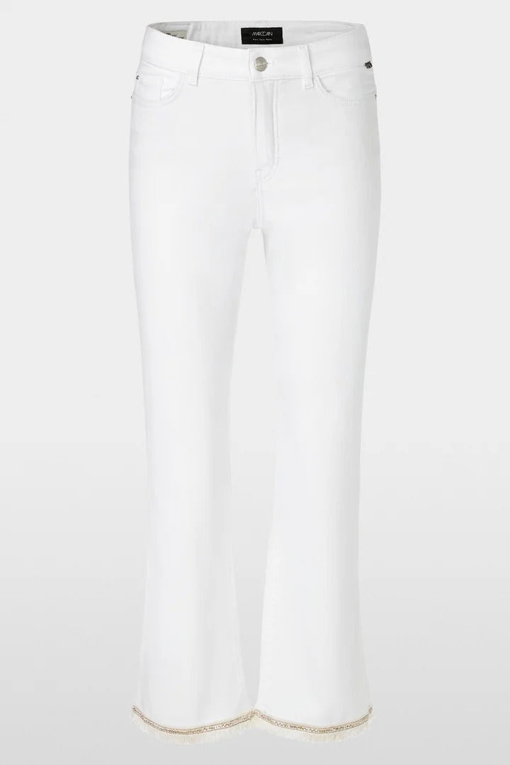 These cropped jeans from Marc Cain add a touch of sparkle to your everyday wardrobe. Designed in crisp white, they feature subtle silver chain detailing along the fringe hem for a playful yet refined twist.