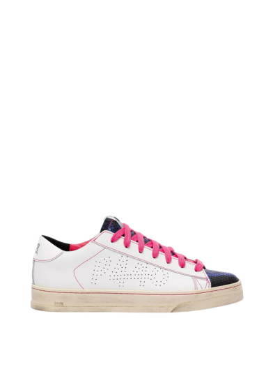 These sneakers boast a white leather upper intricately embossed with the coveted P448 logo and a striking blue hex tongue, heel tab, toe, and trim that add a pop of color to your classic look. The memory foam insole and terry cloth lining ensure a comfortable stride, so you can focus on your day, not your footwear. The shoes’ attention-grabbing pink soles and matching laces promise to provide a dash of colorful character to your everyday ensemble.