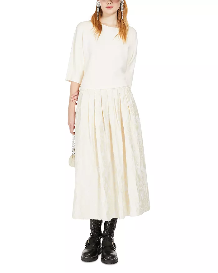 Full skirt in fine cotton fabric featuring all-over embroidered detail. The unlined model boasts an elasticated waistband and in-seam side pockets.