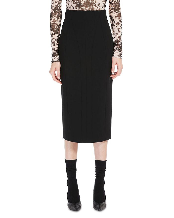 High-waisted bodycon skirt in cady fabric. The fitted design boasts silhouette-defining vertical dart detail