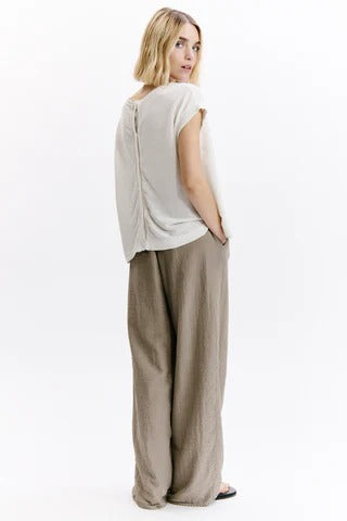 Crafted in a fine, cotton/linen blend knit, this top features a relaxed, straight cut, wide neckline, ribbed edge at sleeve, button down back and raised seam down centre front.