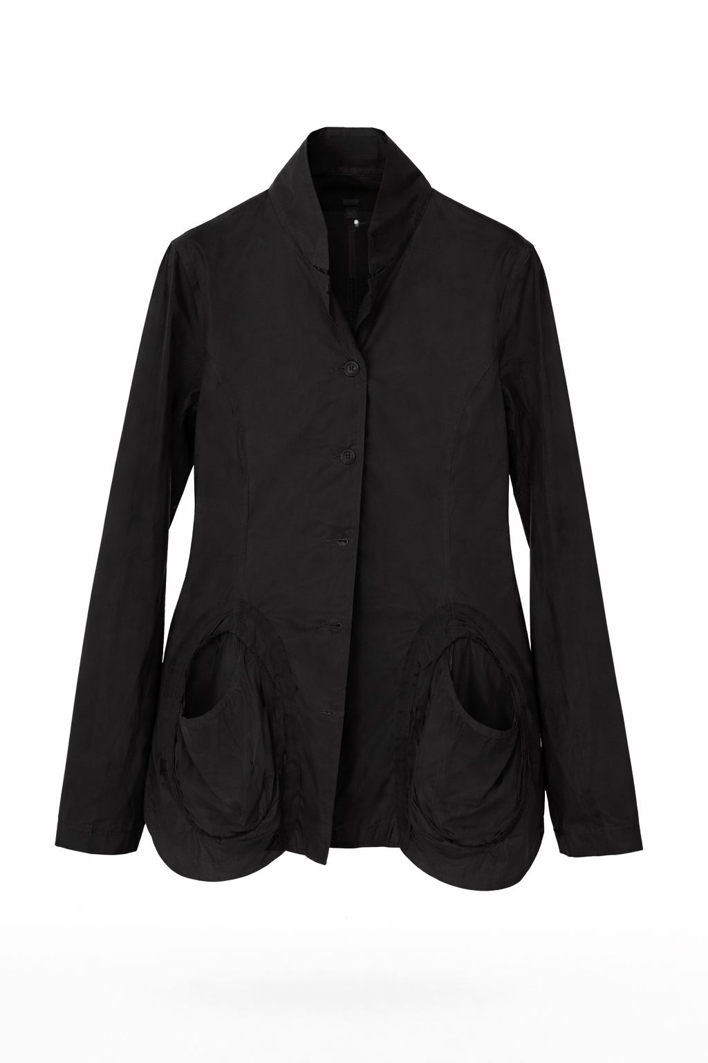 This black Rundholz jacket features a softly structured silhouette with a distinctive stand collar and clean button-front closure. Thoughtfully placed curved patch pockets add volume and architectural interest, balancing practicality with design-led detail. Cut with ease through the body, it layers effortlessly while maintaining a refined, modern line.