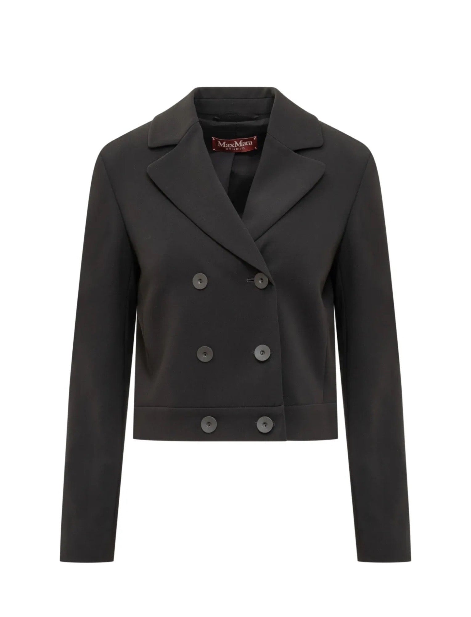 Double-breasted crop jacket made of technical cady, closed with buttons. It is completed with a lapel collar and long set-in sleeves. Lined. Length 50 cm.