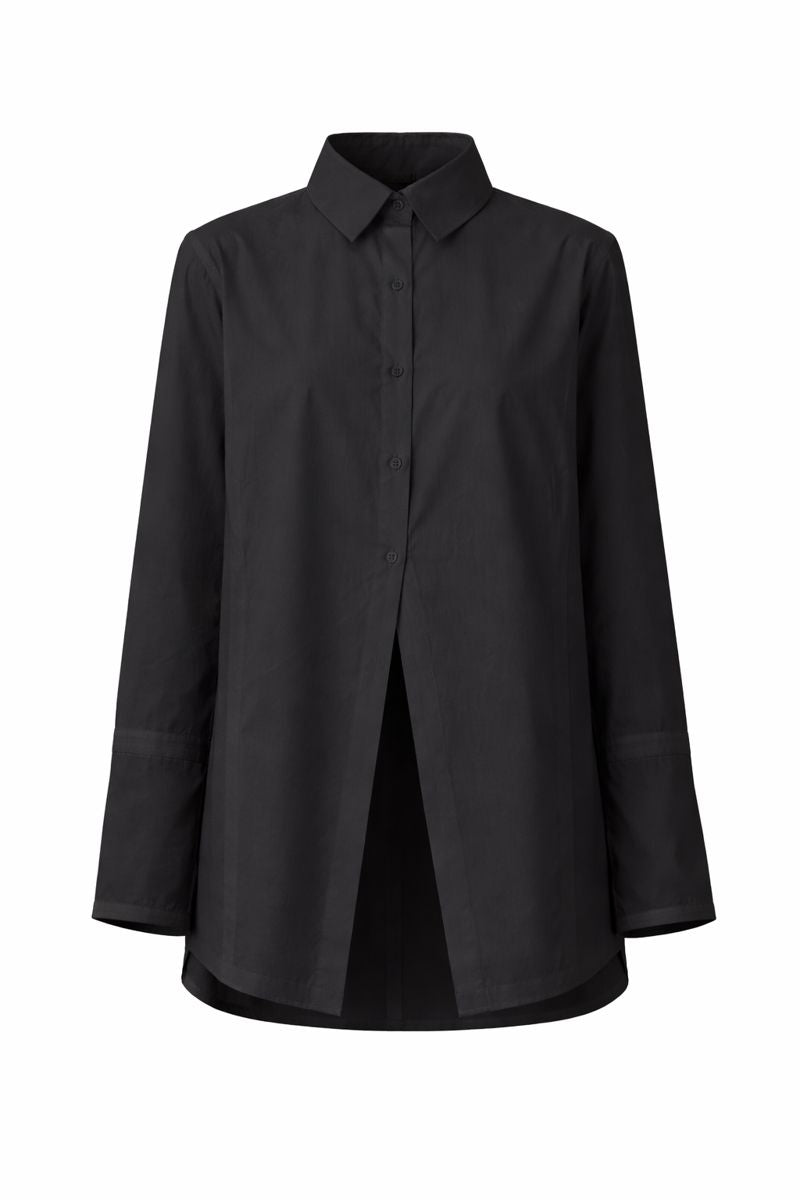 Crafted in crisp, fluid cotton, the silhouette is clean and elongated, falling effortlessly through the body. A sharp, structured collar and concealed button placket maintain a sense of purity and restraint, while the subtle front split introduces movement and a quietly subversive edge. Long sleeves with understated cuffs complete the look with considered precision.