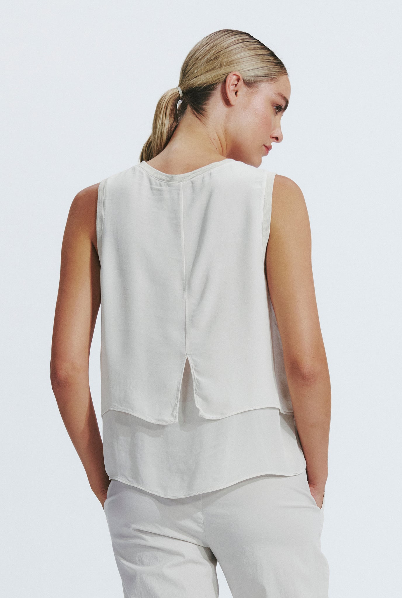 Round neck, comfort fit tank top, with ribbed collar and cuffs. Linen jersey on the front and two asymmetric layers of viscose georgette on the back. Garment dyed.