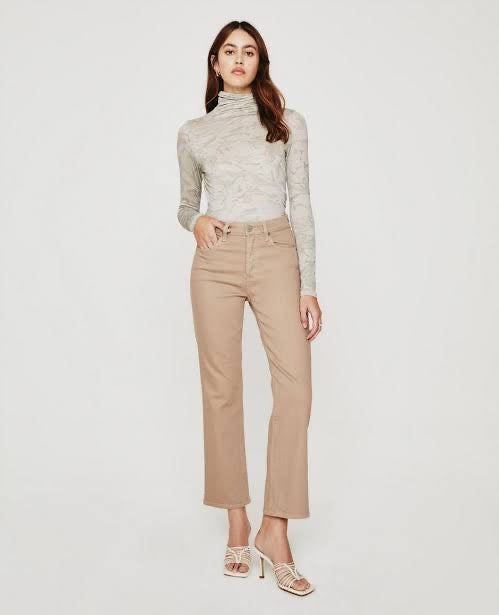 The Kinsley is a crop flare jean featuring an ultra-high waist, button fly, and hems that land above the ankle. This pair is cut from 10 oz. Dover Stretch Denim with a warm beige color and a touch of fading along the edges.