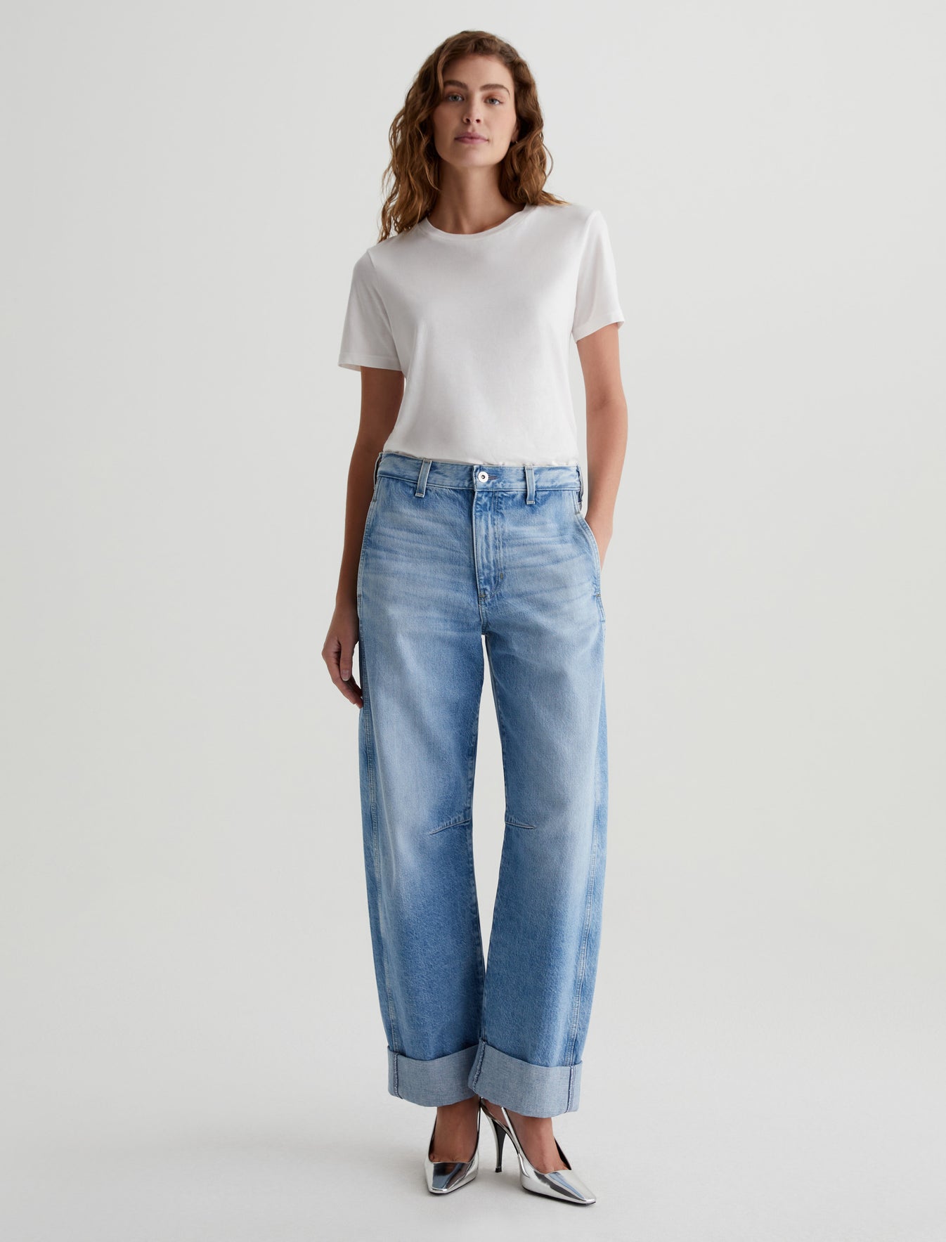 Inspired by our Hattie fit, the Mercer barrel-leg jeans feature a high-rise waist, loose top block, and curved outseam. Detailed with side seam pockets for a clean look, the style has darted knees and double-cuffed hems. This pair is crafted from 13 oz. Sioux Rigid Denim in a faded light blue wash.