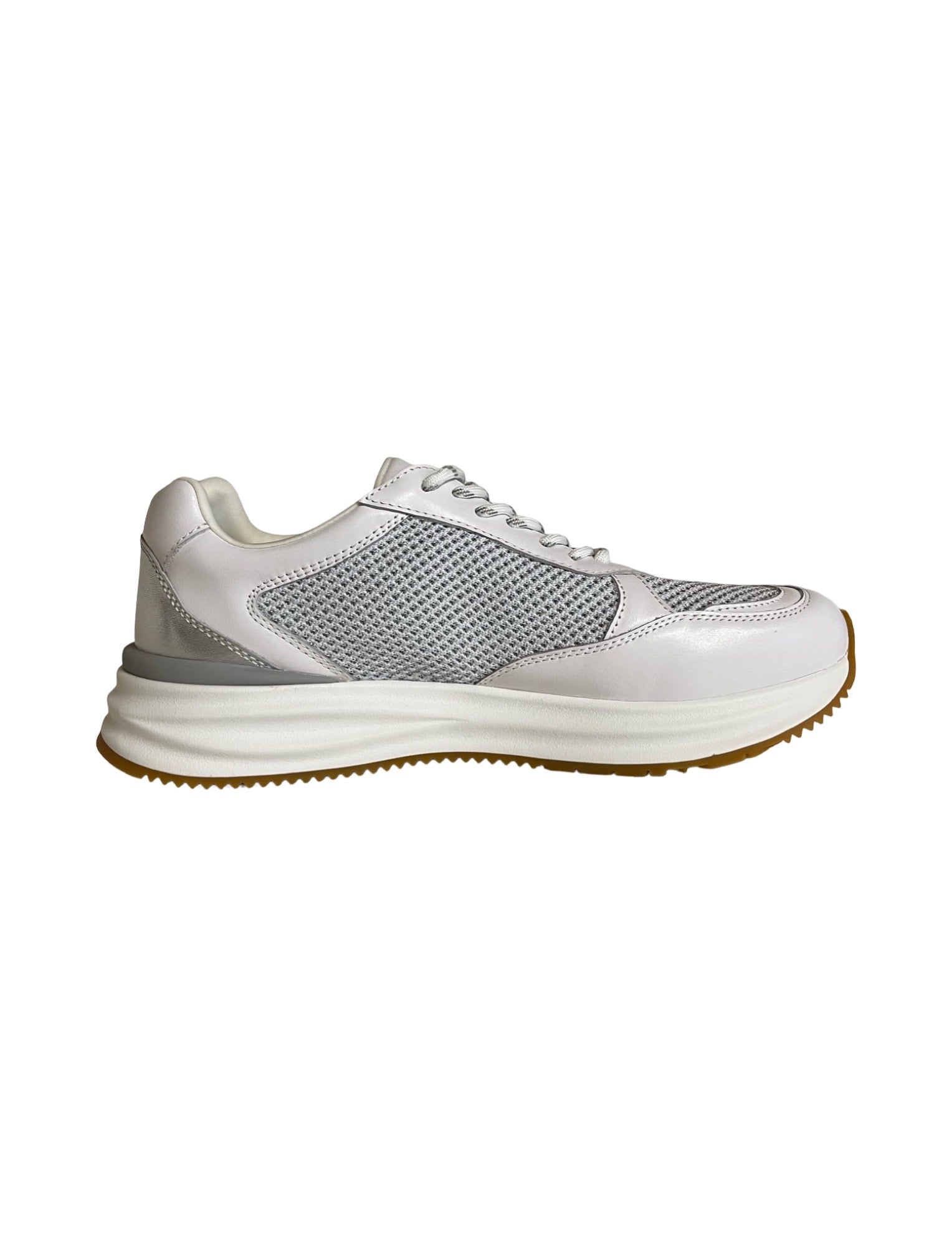 Marc Cain lurex sneakers, 'Spring' theme, made of a combination of materials: leather, textile and rubber, the model has a rounded toe, a lace-up fastening, a metallic effect detail at the back, sole height: 3.5 cm.
