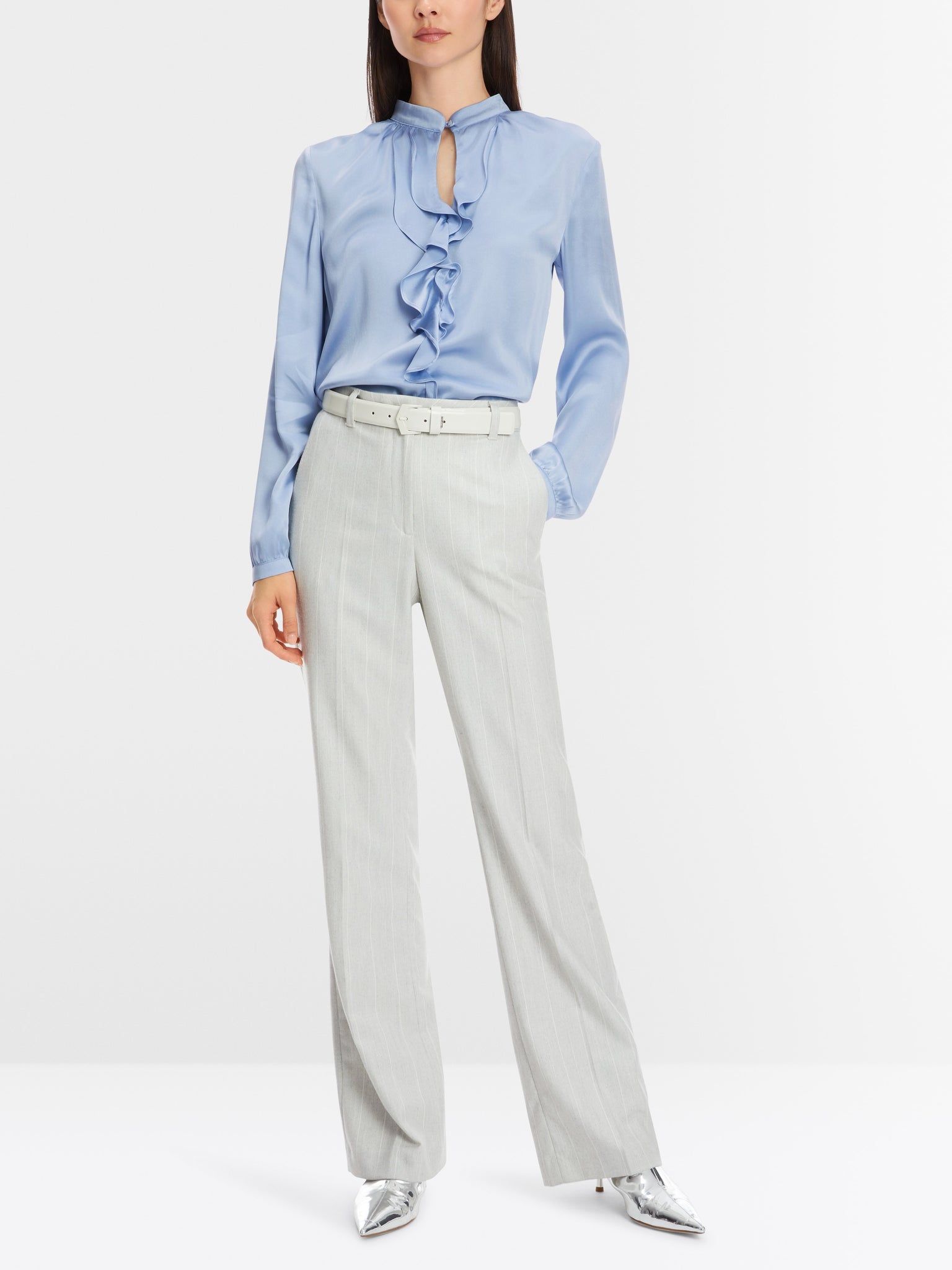 The FAID have a feminine cut and are inspired by men's trousers. The patch waistband, wing pockets and creases are typical. The legs have a trendy bootcut. The soft, flowing fabric contains viscose and virgin wool. The tonal pinstripe is interspersed with glitter stripes. For the office and the city.