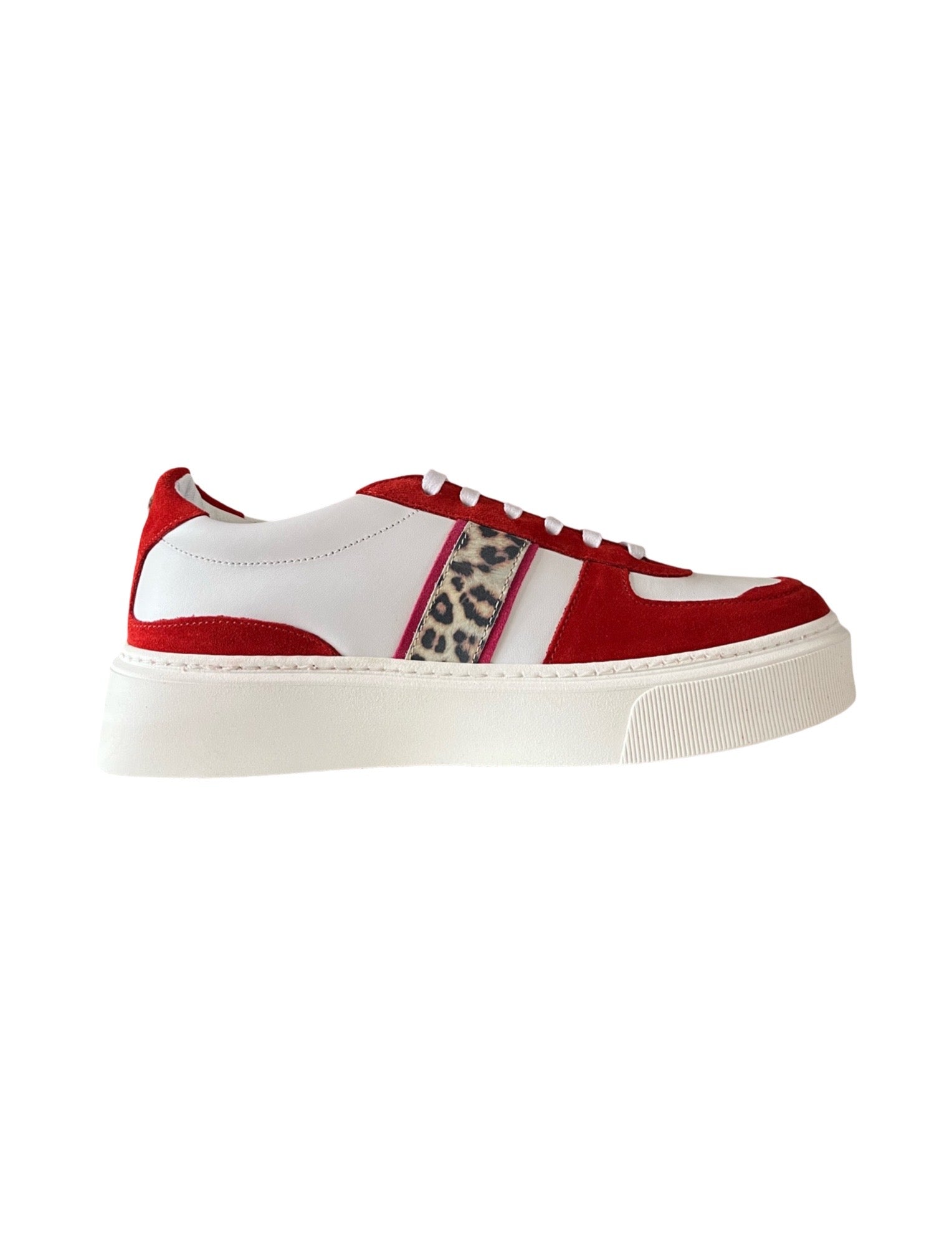 Crafted in smooth white leather with rich red suede overlays and a hint of leopard print, this pair strikes the perfect balance between bold and wearable. A chunky sole lends modern lift, while the cushioned footbed ensures day-long comfort.